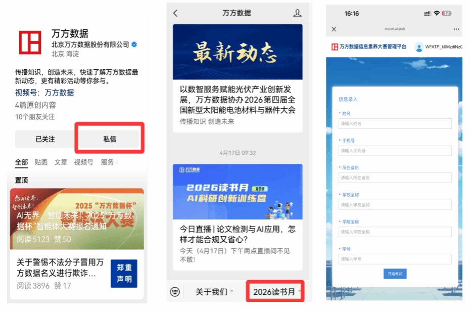 1、关注“万方数据”官方公众号,从私信进入:2026 读书月(右下角)→高校知识答题竞赛(或直接扫描二维码进入答题页面)。