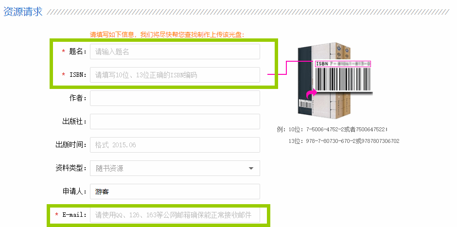 若数据库内没有找到所需随书资源,可求助于“资源请求”服务,填写书名、ISBN、和E-mail即可(如下图所示)。