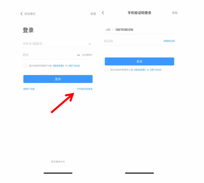 ●打开学习通,在登录页面先点击“手机号快捷登录”,进入注册页面,填写“手机号”,获取验证码并填写,点击“登录”。