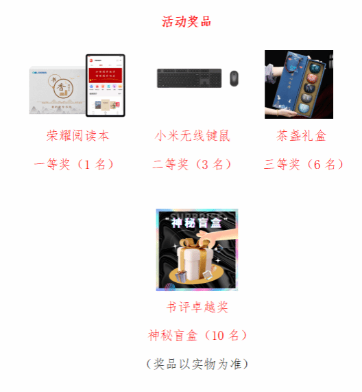 (1)阅读时长排名赛:活动期间,在“书香中国”数字阅读平台登录账号,阅读书籍、听书、期刊总时长排名前10名用户可获得精美礼品。
