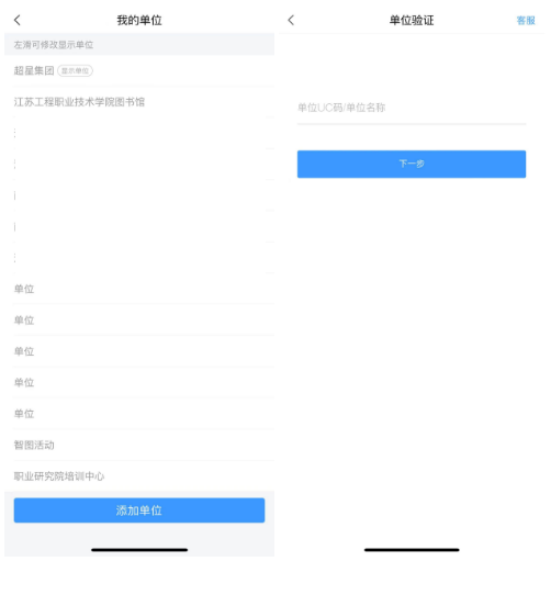 ●右下角点击“我”,点击头像 ➡绑定单位 ➡ 添加单位 ➡江苏工程职业技术学院图书馆 ➡跳转统一身份认证绑定学工号
